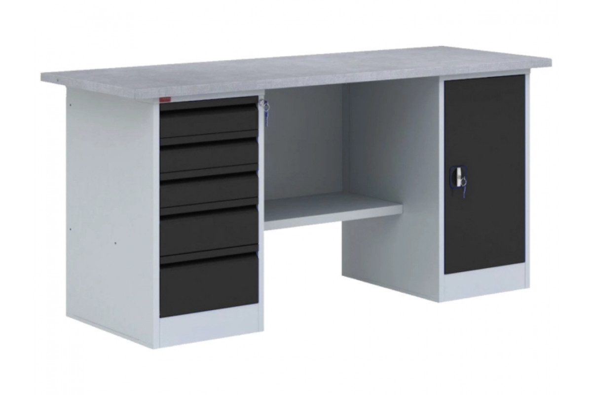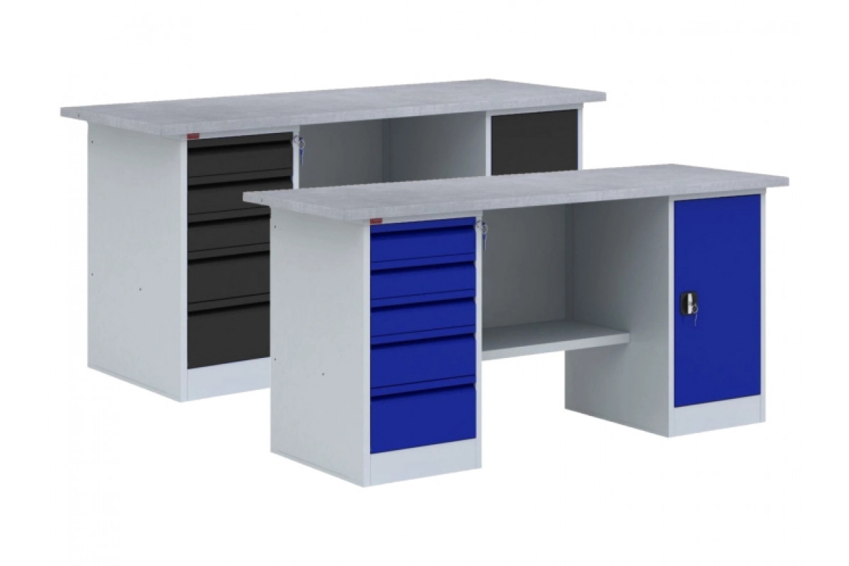 Верстак ВП-4 состоит из отдельных модулей: столешница из МДФ, покрытая оцинкованным листовым металлом, стенка задняя – металлическая, тумба с двумя съемными полками (нагрузка до 30 кг) и дверью запирающейся замком, тумба с 5-ю выдвижными ящиками (нагру