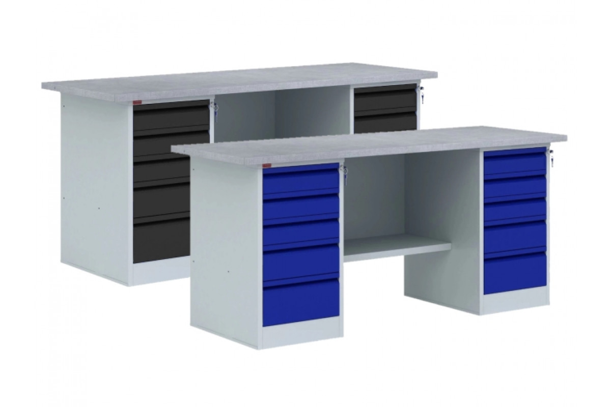 Верстак состоит из отдельных модулей: столешница из МДФ, покрытая оцинкованным листовым металлом; стенка задняя металлическая; две тумбы с 5-ю выдвижными ящиками на телескопических направляющих (нагрузка 30 кг) запирающимися на центральный замок; полка