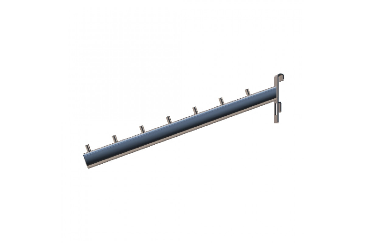 Кронштейн наклонный на панель-сетку длина 400 мм с 7 ограничителями-штырьками, изготовлен из плоскоовальной трубы 30*15 мм, покрытие хром, максимальный размер ячейки 50*50 мм. Кронштейн может быть использован для демонстрации любой одежды и нижнего бел