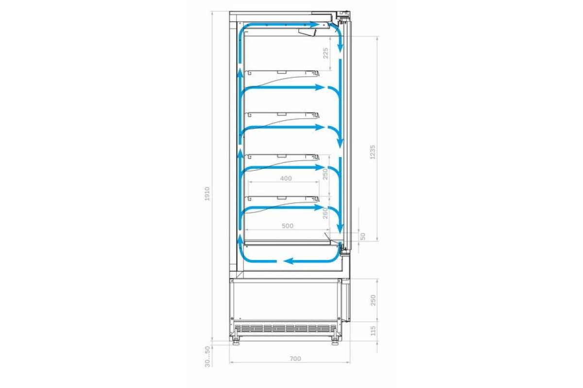 Холодильная горка гастрономическая Carboma FC 20-07 VM 0,6-1 0030 Light (фронт X0) (версия 2.0) 9006-9005 элегантно впишется во все торговые зоны от магазинов по соседству до гипермаркетов. Размещение большого количества товара на минимально возможном пространстве. Витрина должна быть установлена не ближе 2 м от отопительных приборов. Запрещается эксплуатация витрины при попадании на нее прямых солнечных лучей, воздушных потоков от кондиционеров, вентиляторов и обогревателей. Просвет между задней стенкой витрины и стеной помещения должен быть не менее 0,25 м. Запрещается загораживать воздуховоды. При дождливой или влажной погоде на витрине может выпадать конденсат. Это не является неисправностью. В этом случае время от времени протирайте витрину мягкой тканью.