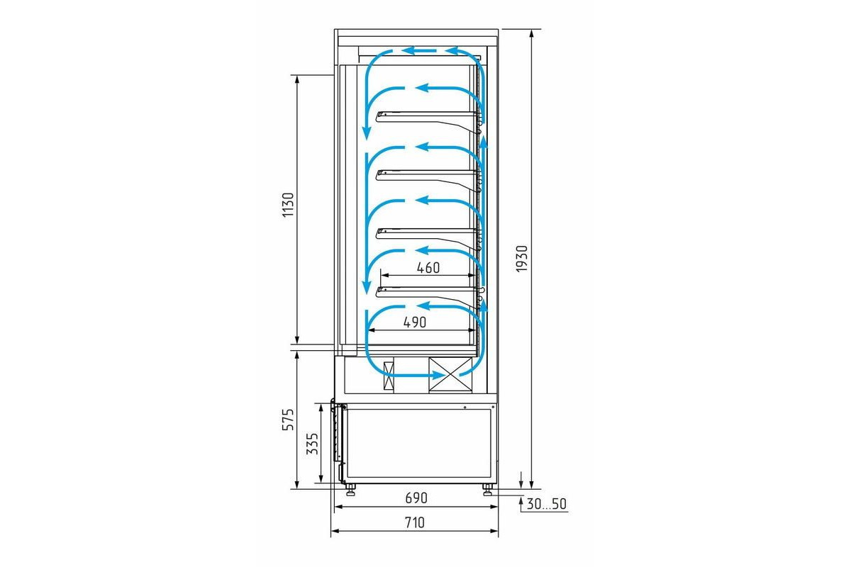 - Глубина выкладки полок 460 мм + основание горки с глубиной 490 мм;
