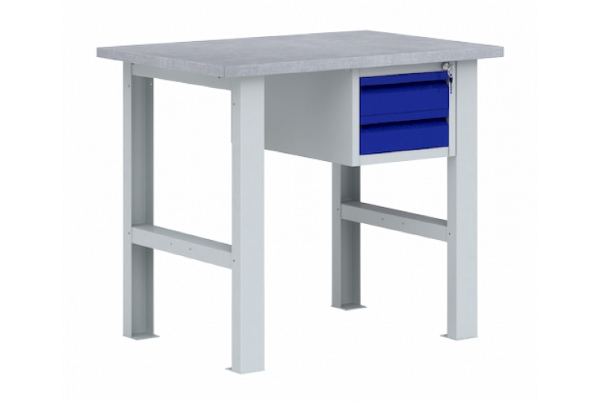 Верстак ВП-Э состоит из отдельных модулей: столешница из МДФ, покрытая оцинкованным листовым металлом; две металлические верстачные опоры; одна подвесная тумба (нагрузка до 30 кг на каждый ящик). Верстак может комплектоваться перфорированным экраном со