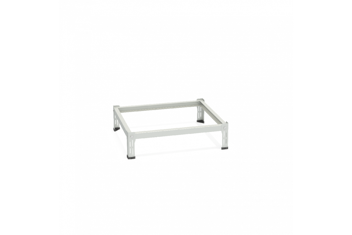 Металлическая подставка серии РСМ представляет собой сборно-разборную жесткую конструкцию, состоящую из четырех горизонтальных балок (две продольные и две поперечные) и четырех опор (ножек). Сборка подставки осуществляется при помощи винтов М4х10 и фланцевых гаек М4. На ножках подставки для сборки предусмотрены по четыре квадратных отверстия размером 5х5 мм, на продольных балках предусмотрены восемь овальных отверстий, на поперечных балках по четыре овальных отверстия размером 5.5х6.5 мм. Детали подставки выполнены из качественной холоднокатаной конструкционной стали марки 08 пс, на ножках толщина стали составляет 1 мм, на балках толщина стали составляет 0.8 мм. Каждая из четырех балок имеет гнутый П-образный профиль. На двух продольных балках предусмотрены боковые отгибы, которые вкладываются внутрь поперечных балок и формируют замкнутый контур по периметру подставки. В комплектацию подставки входят четыре уголка специальной формы, каждый уголок устанавливается во внутренний угол основания подставки (сформированный балками) и усиливает конструкцию. Ножки подставки выступают вверх над балками и формируют четыре угловых ограничителя для надежной фиксации корпуса шкафа. Высота зазора между полом и основанием шкафа, установленным на подставку, составляет 150 мм. На каждой ножке подставки предусмотрена декоративная перфорация в виде четырех вертикальных пазов шириной по 3 мм. Для сохранности напольного покрытия, подставка оснащена четырьмя пластиковыми подпятниками, которые устанавливаются в «натяг» на ножки и не требуют дополнительного крепления. Цвет пластиковых подпятников - черный.
