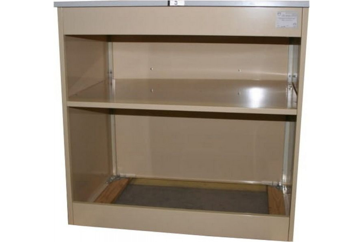 - Корпус выполнен из оцинкованной стали серого цвета, столешница - из шлифованной нержавеющей стали.