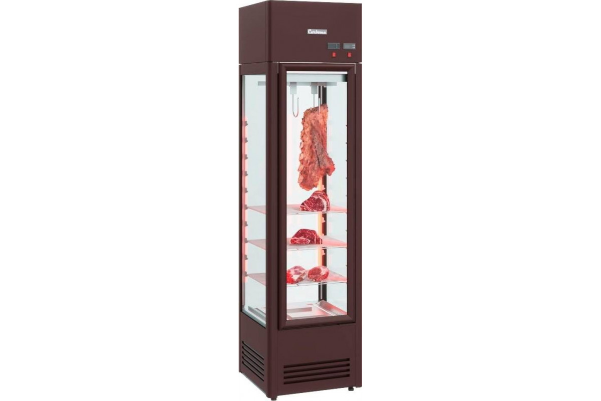 Холодильный шкаф Сarboma D4 VM 400 HHC 0102 предназначен для демонстрации ассортимента мясной продукции заведения, недолгого их хранения, вызревания кусков мяса перед приготовлением стейков при определенной температуре и влажности. Такое оборудование устанавливается в заведениях общепита, в меню которых присутствуют стейки из ферментированного мяса.