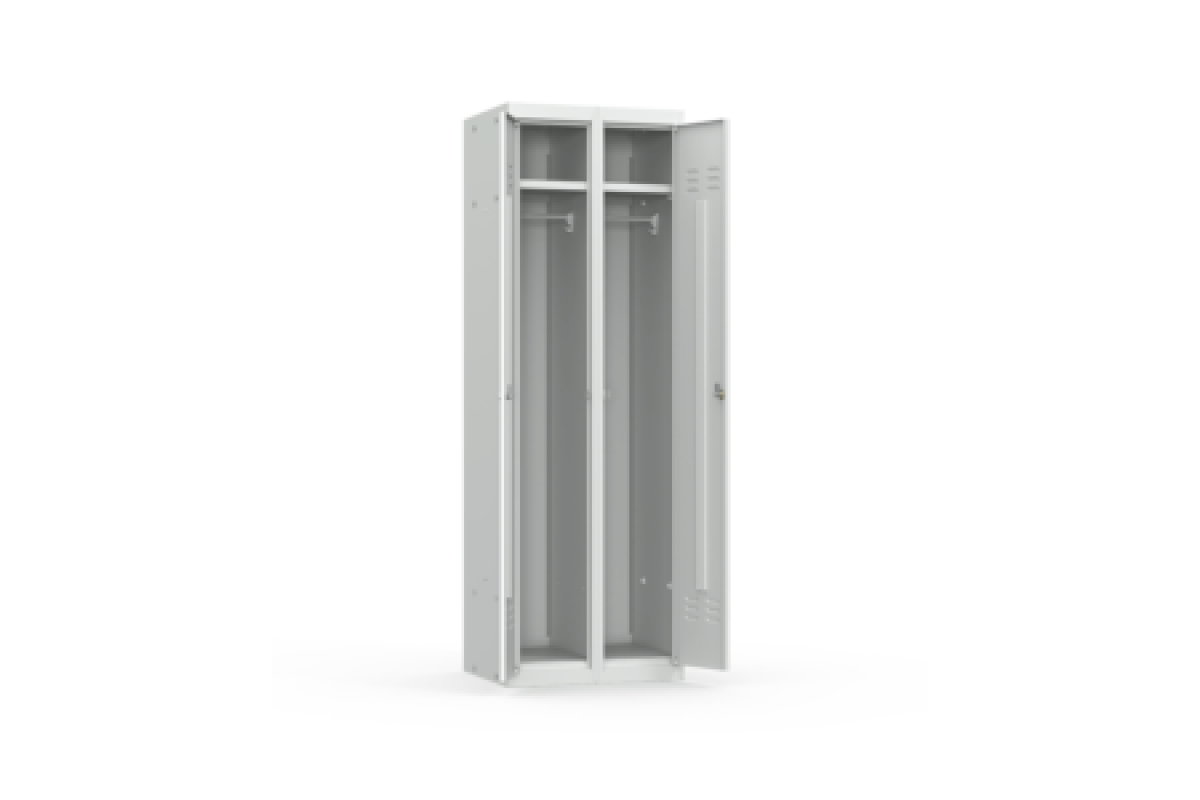 Шкаф имеет две секции, каждая из которых оснащается полкой для головных уборов, пластиковыми перекладиной для вешалок и двумя крючками для одежды, проушиной для навесных замков. Размер секций обеспечивает комфортное размещение верхней одежды, в том числе зимней. Конструкция предусматривает возможность установки дополнительной полки для обуви.