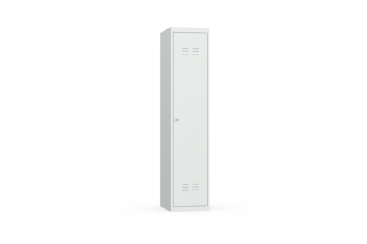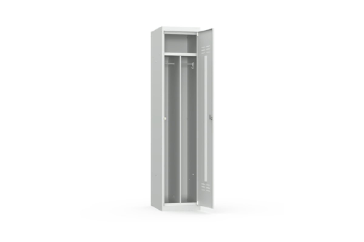 Односекционный металлический шкаф предназначен для раздельного хранения вещей. Особенностью шкафа является внутренняя перегородка, создающая две раздевальные зоны, в каждой из которых имеются металлические перекладины для вешалок, два пластиковых крючка для одежды. В шкафу также имеется объединенная полка для головных уборов.