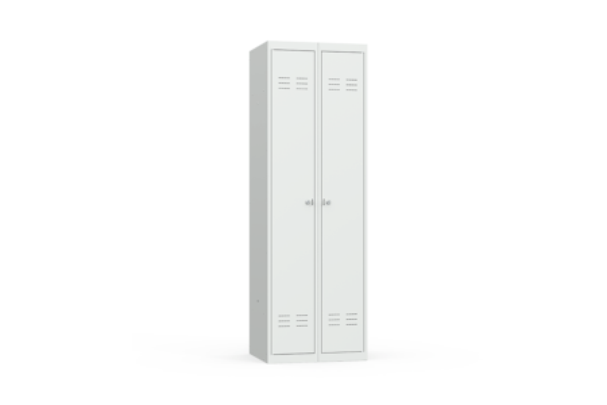 Шкаф имеет две секции, каждая из которых оснащается полкой для головных уборов, металлической перекладиной для вешалок и двумя пластиковыми крючками для одежды, проушиной для навесных замков. Размер секций обеспечивает комфортное размещение верхней одежды, в том числе зимней. Конструкция предусматривает возможность установки дополнительной полки для обуви.