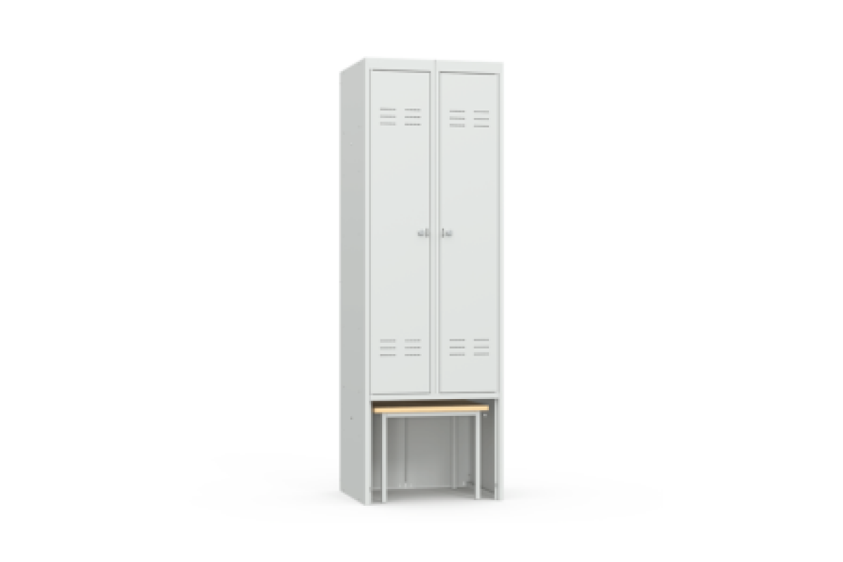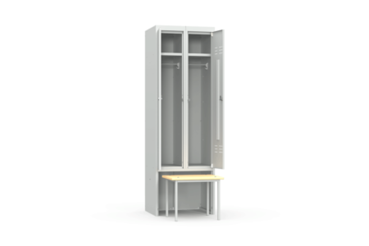Шкаф металлический для одежды серии ШР-22 L600 ВСК с выдвижной скамьей предназначен для хранения одежды в офисных и подсобных помещениях, общественных и государственных учреждениях, спортивных раздевалках.