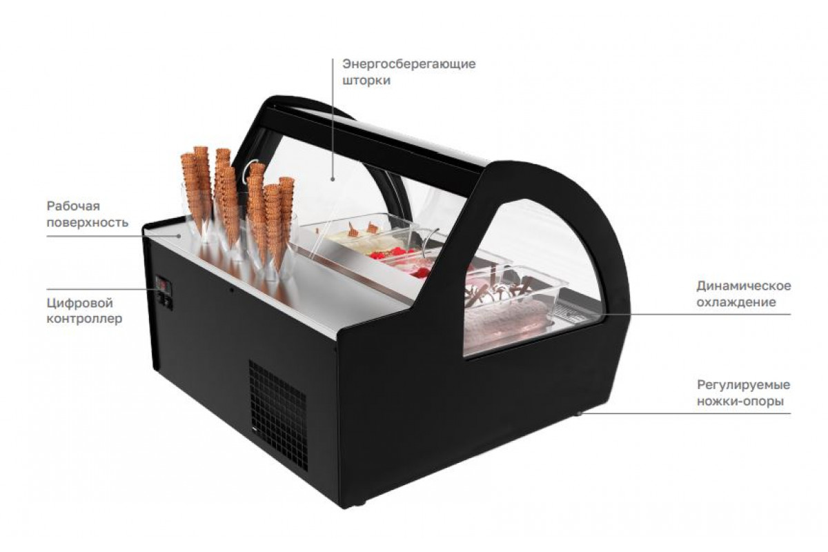 Витрина для мороженого Carboma JOY 2 I83 VL 1,2-1 (0430) используется на предприятиях общественного питания и торговли для охлаждения, хранения и демонстрации мягкого и других видов мороженого. Отлично впишется в любой дизайн помещения. Витрина имеет изогнутый фронтальный и боковые стеклопакеты. Прекрасная видимость ассортимента обеспечивается за счет приподнятых гастроемкостей. Прекрасная видимость мороженого обеспечивается за счет приподнятых лотков и светодиодного освещения внутри витрины.
