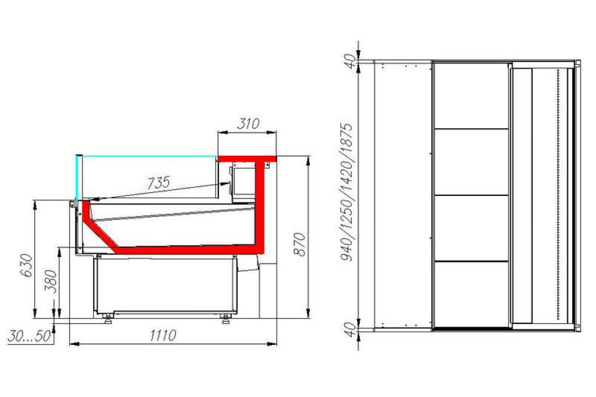 - полка для выкладки с перфорированной поверхностью (отвод талой воды), расположена под наклоном;