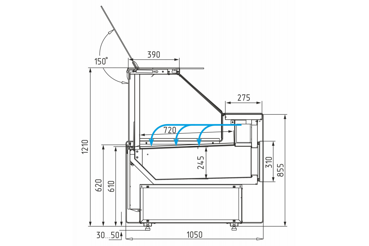 - Экспозиционная поверхность и столешница изготовлены из шлифованной нержавеющей стали, декоративная фронтальная панель – из МДФ;