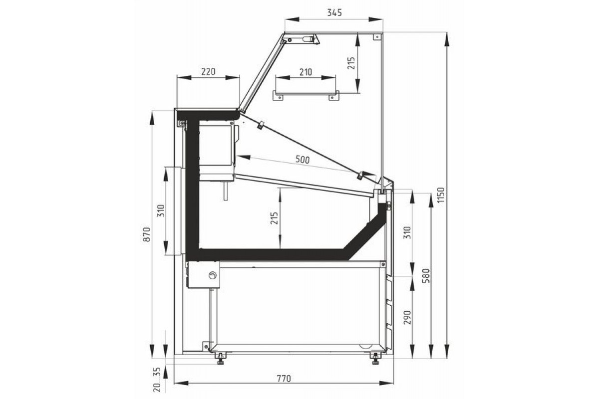 - Стеклянная полка (неохлаждаемая) с глубиной выкладки 210 мм;