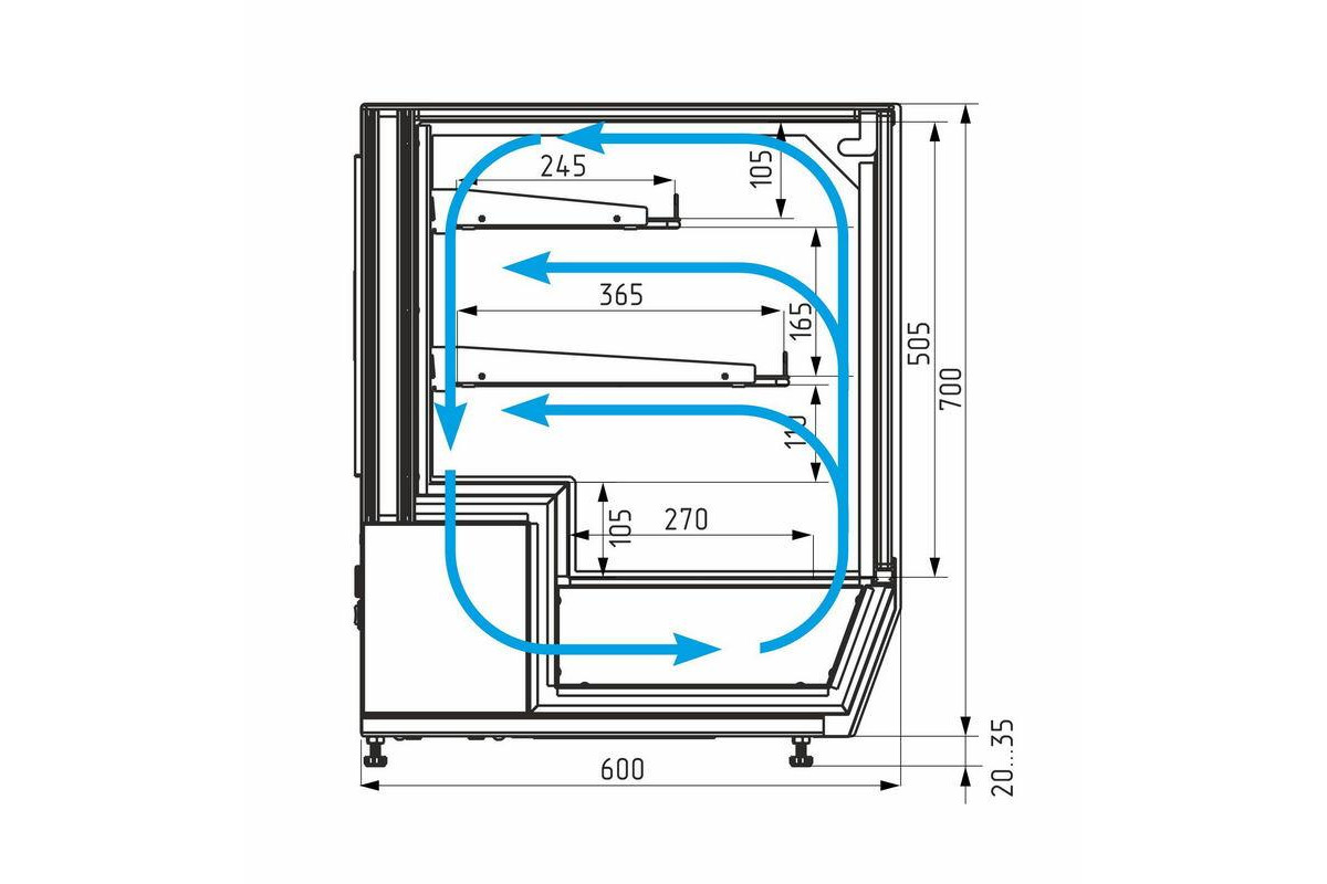 - Глубина выкладки 270 мм + 2 полки: 365 мм и 245 мм;