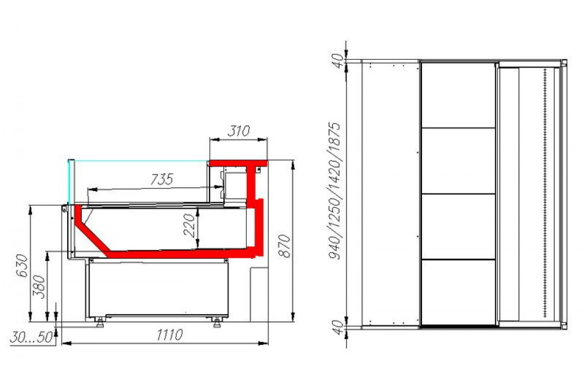 - 2х ступенчатые поддоны для выкладки. Общая высота поддона -120 мм, общая глубина-480 мм;