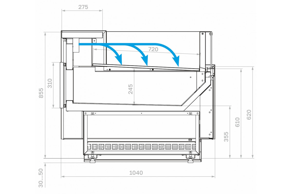- Экспозиционная поверхность и столешница изготовлены из шлифованной нержавеющей стали;