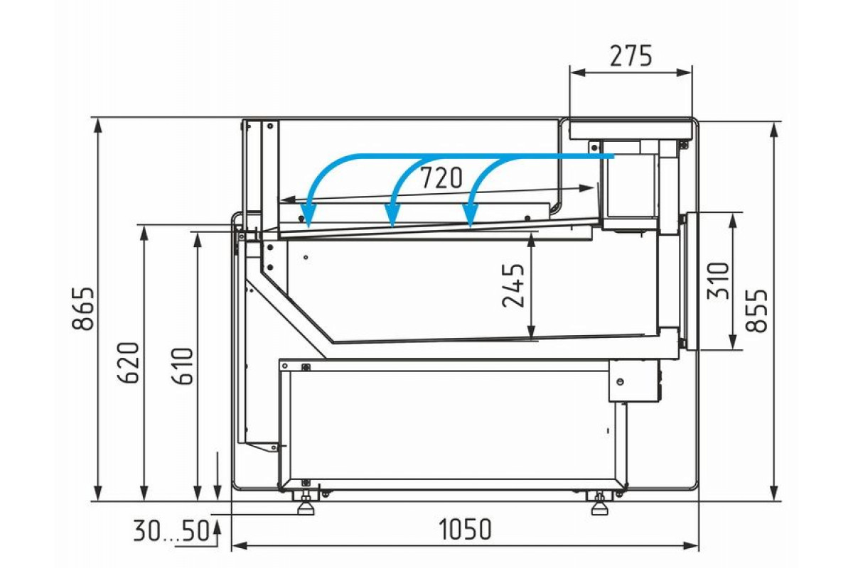 Отдельностоящая витрина приобретается только вместе с боковинами. При заказе нескольких витрин с одинаковым температурным режимом для установки в линию достаточно заказать 2 боковины на всю линию.