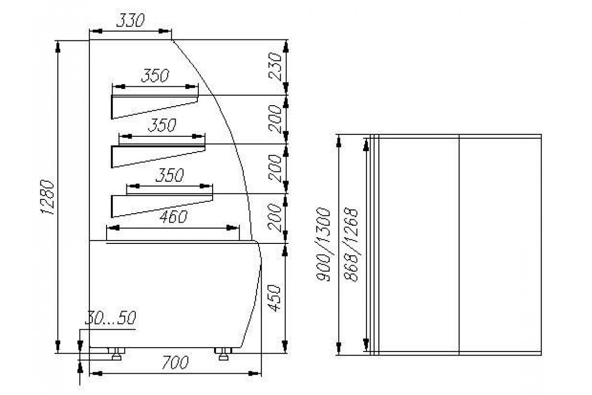 - три стеклянные подогреваемые полки глубиной 350 мм;