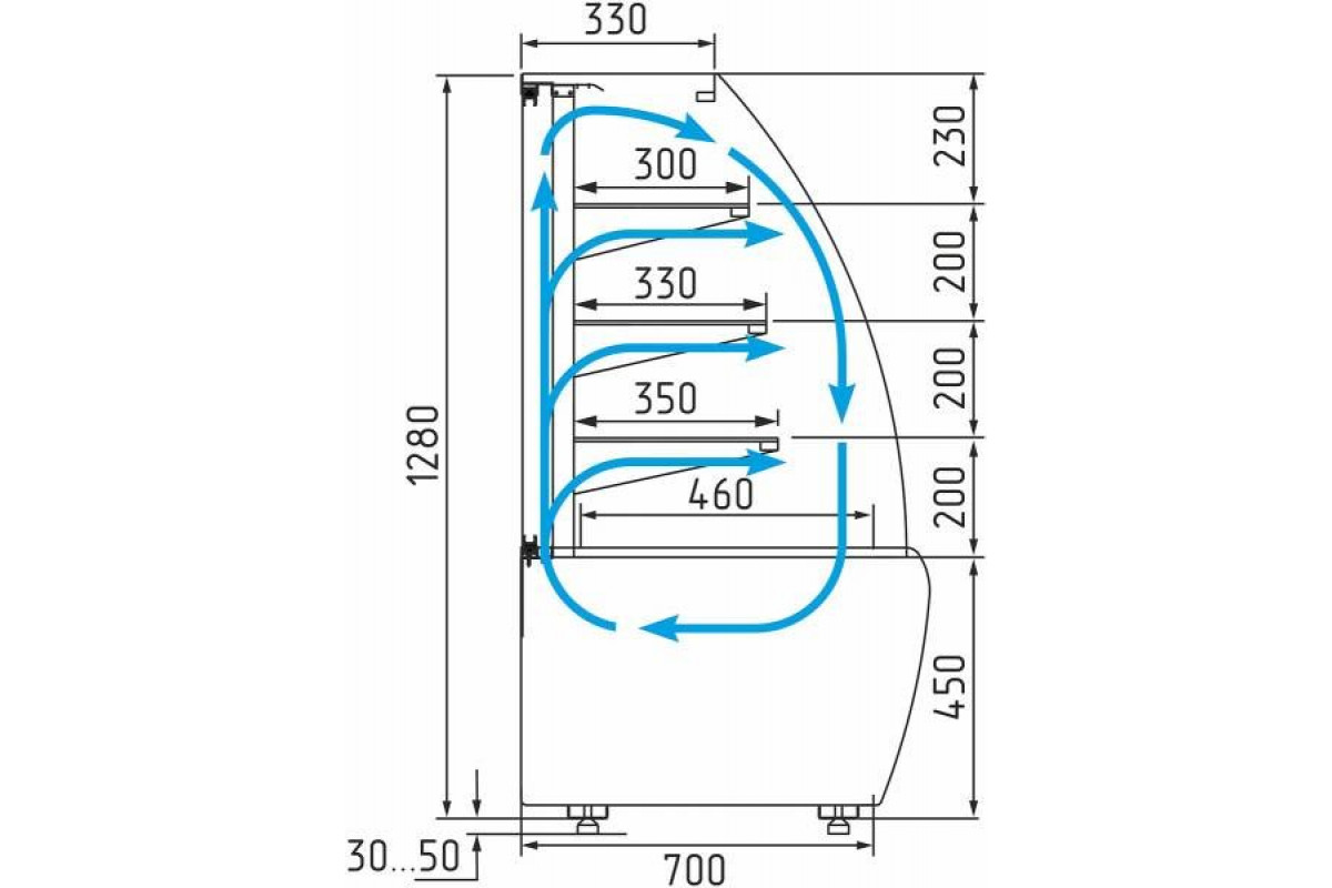 - глубина выкладки 460 мм + 3 полки: 350 мм, 330 мм, 300 мм;