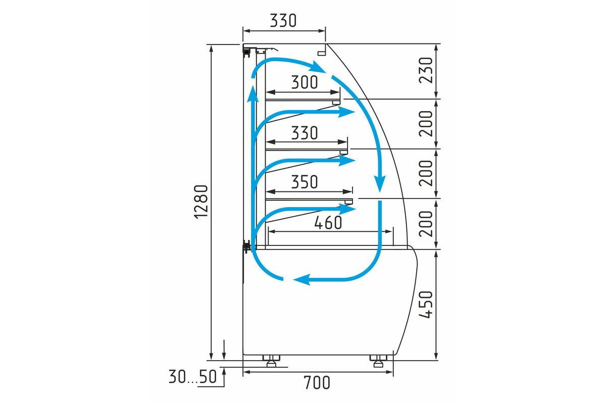 - глубина выкладки 460 мм + 3 полки: 350 мм, 330 мм, 300 мм;