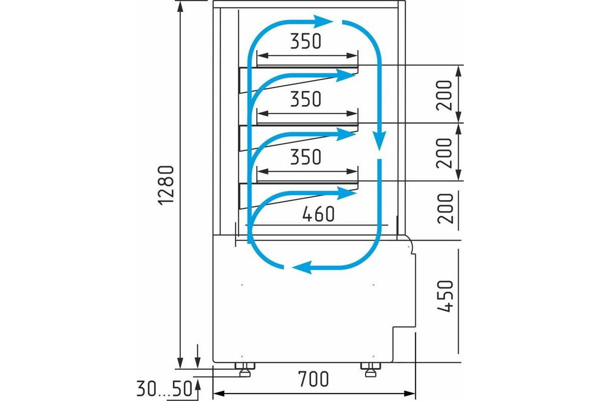- глубина выкладки полок — 350 мм, нижней зоны 460 мм;