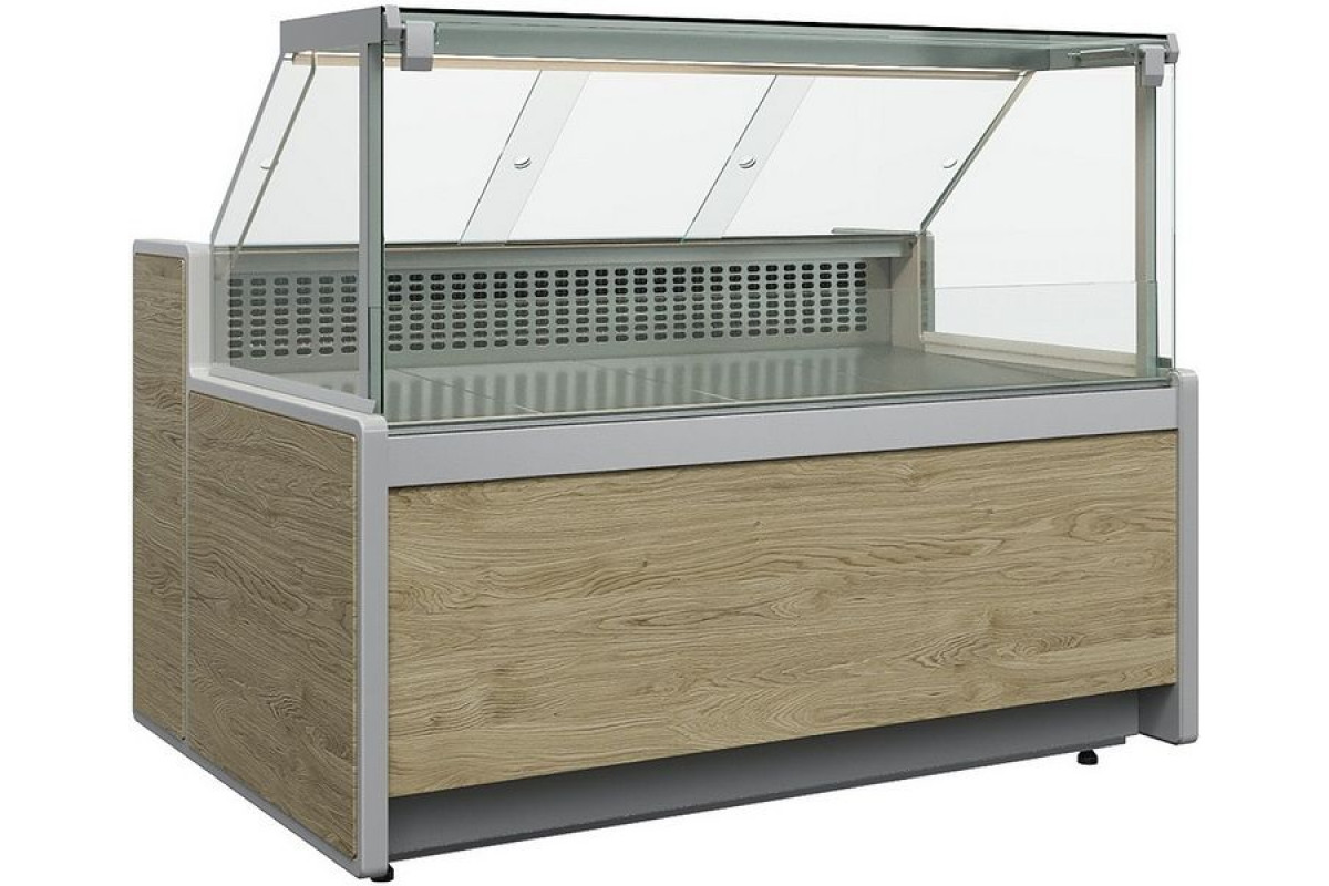 - Экспозиционная поверхность и столешница изготовлены из шлифованной нержавеющей стали, декоративная фронтальная панель – из МДФ;