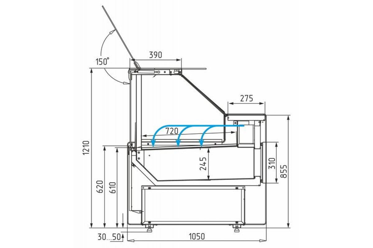 Отдельностоящая витрина приобретается только вместе с боковинами. При заказе нескольких витрин с одинаковым температурным режимом для установки в линию достаточно заказать 2 боковины на всю линию.
