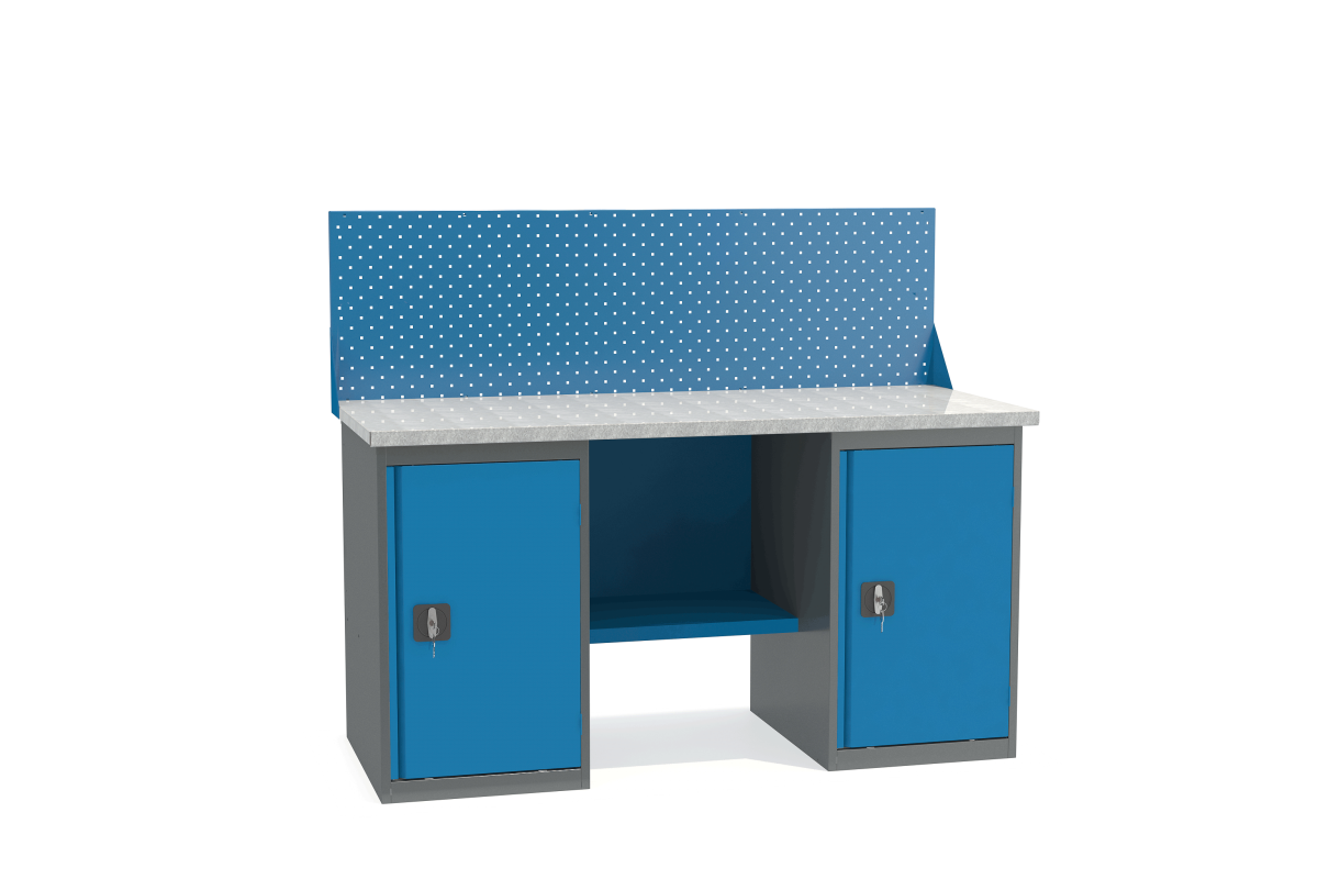 - Верстак имеет надежную модульную конструкцию с усиленной столешницей (плита МДФ 25мм, покрытая листом оцинкованного металла).