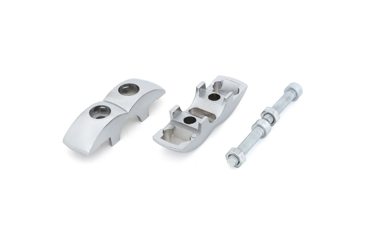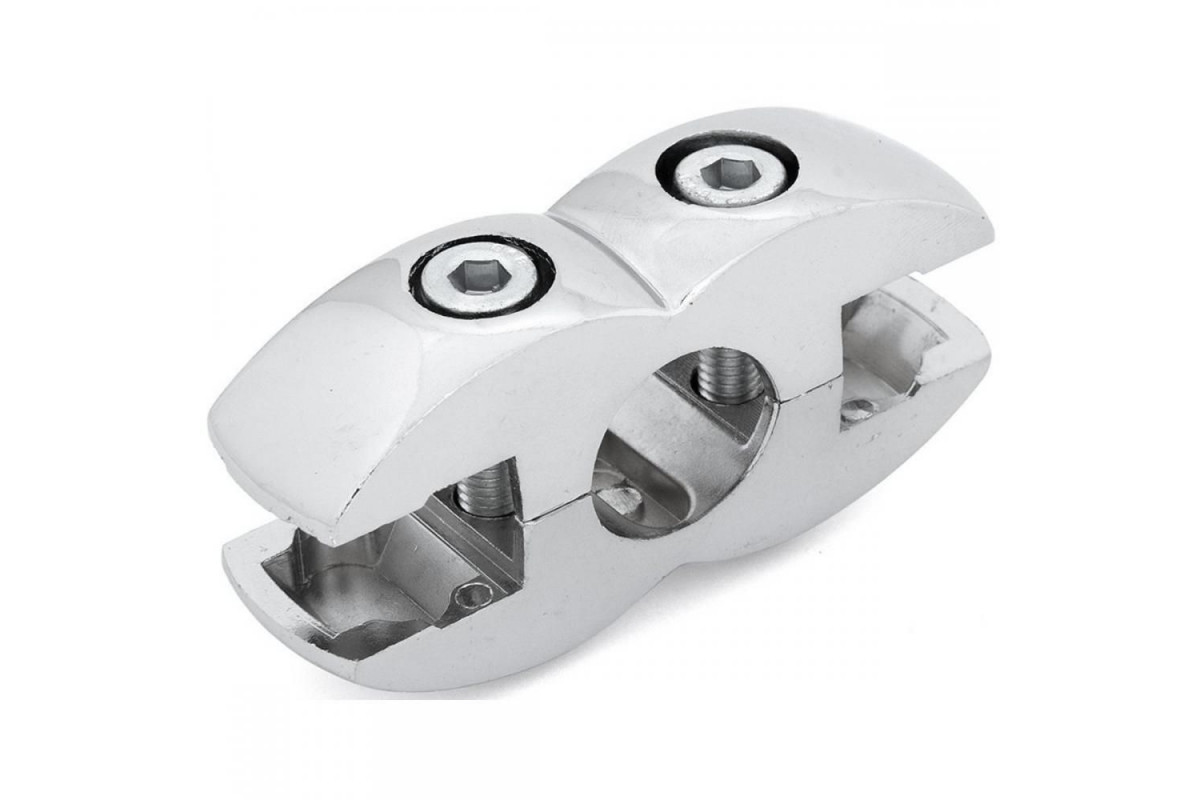 Крепёж двусторонний для панели R7a (jok55) используется для крепления ДСП, стекла или пластика с обеих сторон к хромированной трубе диаметром 25 мм.