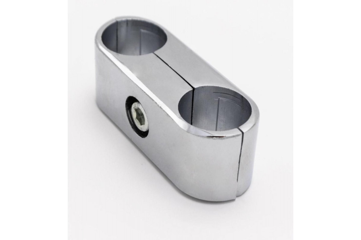 Соединитель применяется для создания усиленных вертикальных стоек. Но благодаря большему расстоянию между фиксируемыми трубами позволяет формировать проходные соединения между труб.