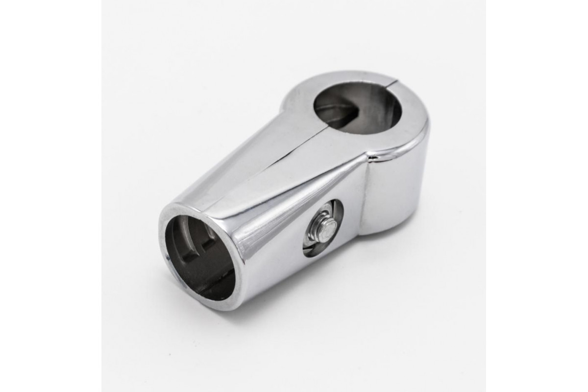Зажим поворотный малый для труб в 4-х направлениях d=25мм, хром, соединяет 3 трубы, одна из труб по центру проходная и 2 другие перпендикулярны c возможностью менять угол поворота (но не менее 90°). Крепеж состоит из двух частей, тем самым упрощая проц