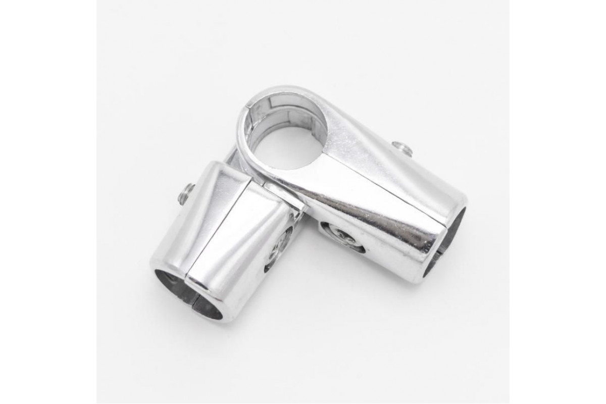 Зажим поворотный малый для труб в 4-х направлениях d=25мм, хром, соединяет 3 трубы, одна из труб по центру проходная и 2 другие перпендикулярны c возможностью менять угол поворота (но не менее 90°). Крепеж состоит из двух частей, тем самым упрощая проц